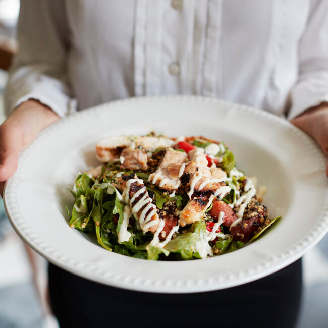 Crisp romaine hearts tossed in our rich, creamy Caesar dressing topped with shaved parmesan, house-made croutons and white anchovies